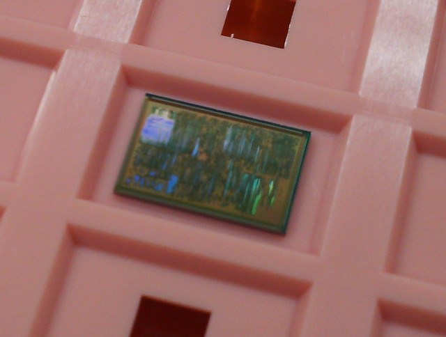 VDECから届いたベアチップを開封しました。高性能低消費電力スーパスカラプロセッサチップです。今後は改良して、ヘテロジニアスマルチコアを目指します。